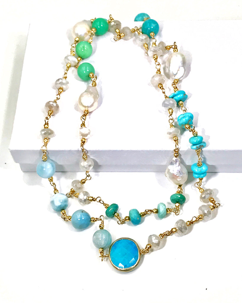 Long Multi Gemstone Pearl Necklace Larimar Sleeping Beauty Turquoise Gold Fill - doolittlejewelry