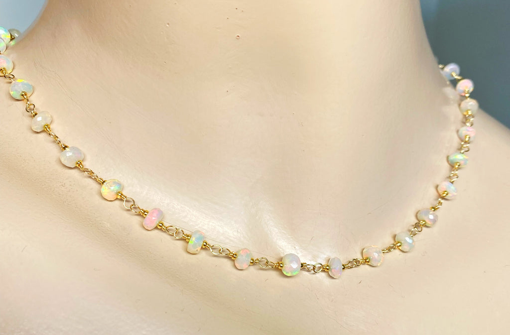 Stunningly beautiful, AAAA Ethiopian opal faceted rondelles are wire wrapped on 14 kt gold filled wires to create a rosary style chain to create this mesmerizing choker necklace.