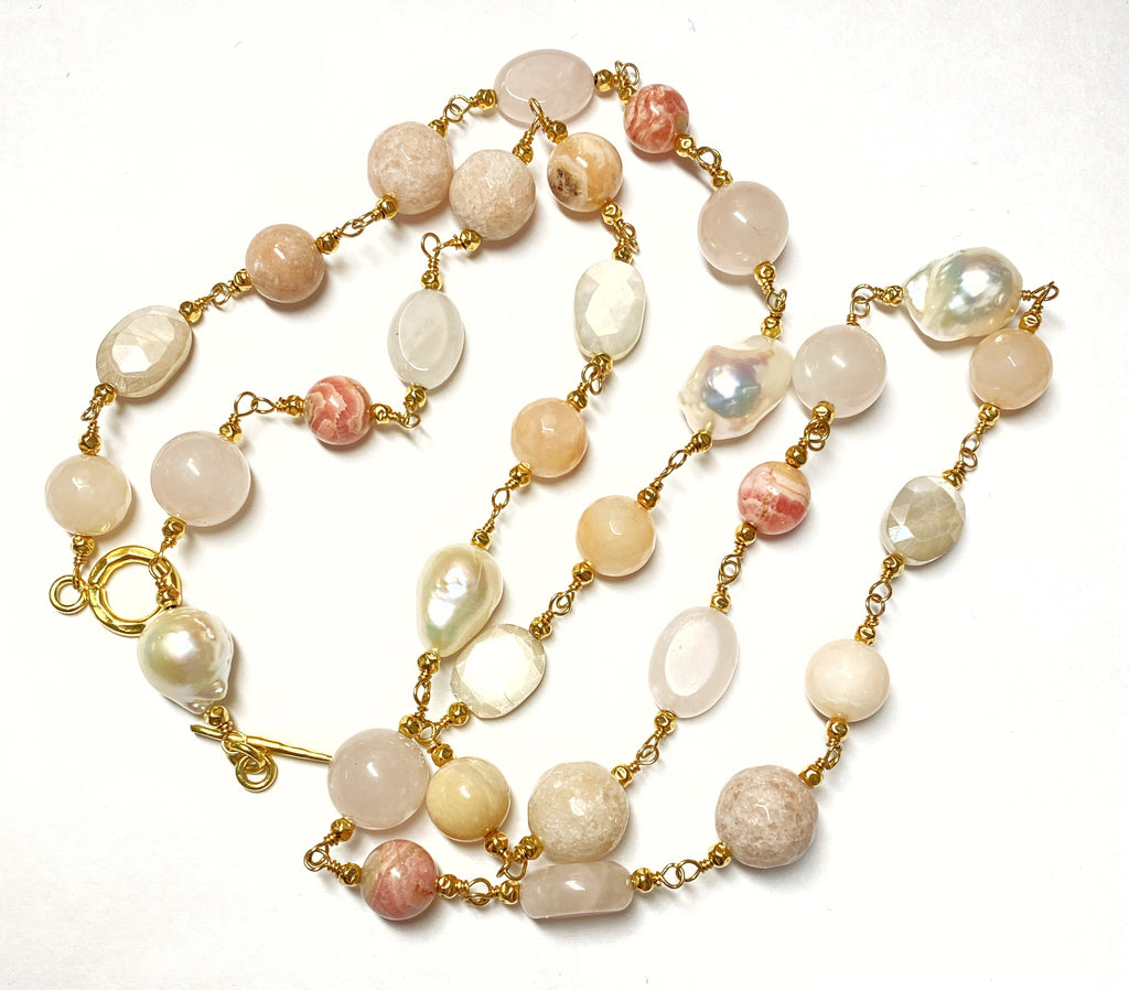 Ivory, blush and pale pink gemstones mix with white baroque pearls to create this long wire wrapped necklace in 14kt gold fill for a soft look.