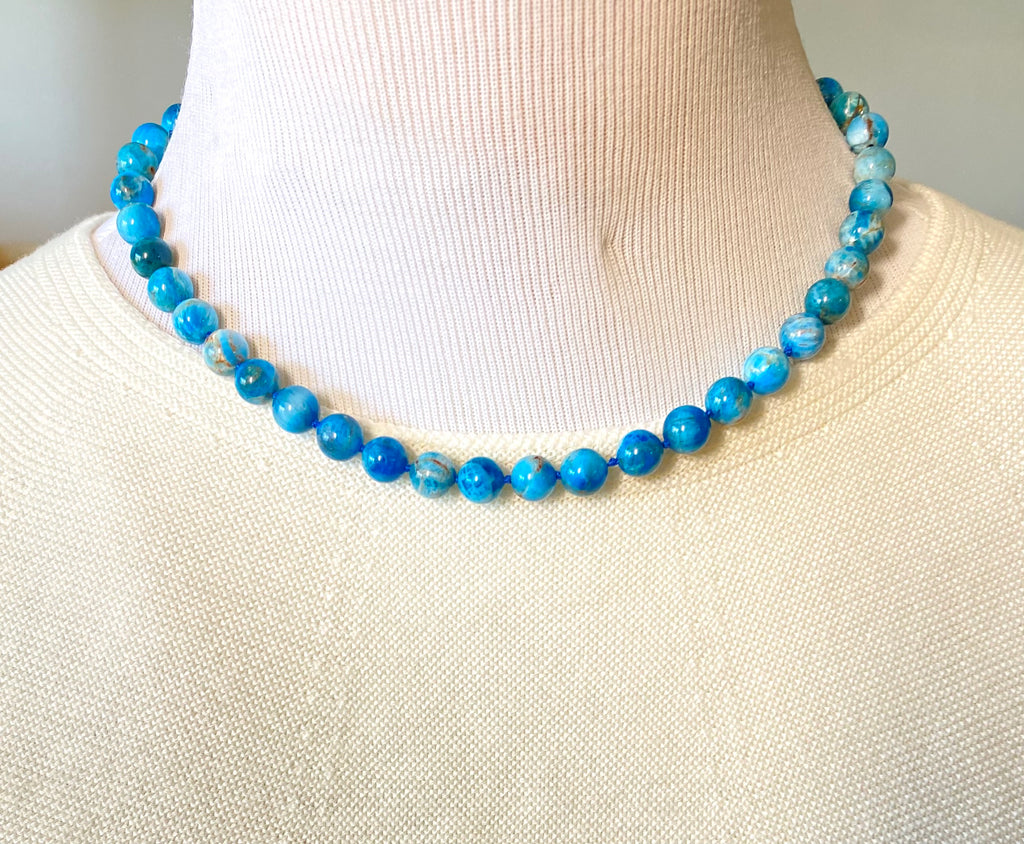 Beautiful, natural gemstone apatite smooth round beads, with its teal blue colors, are knotted on teal blue silk to create this striking necklace.