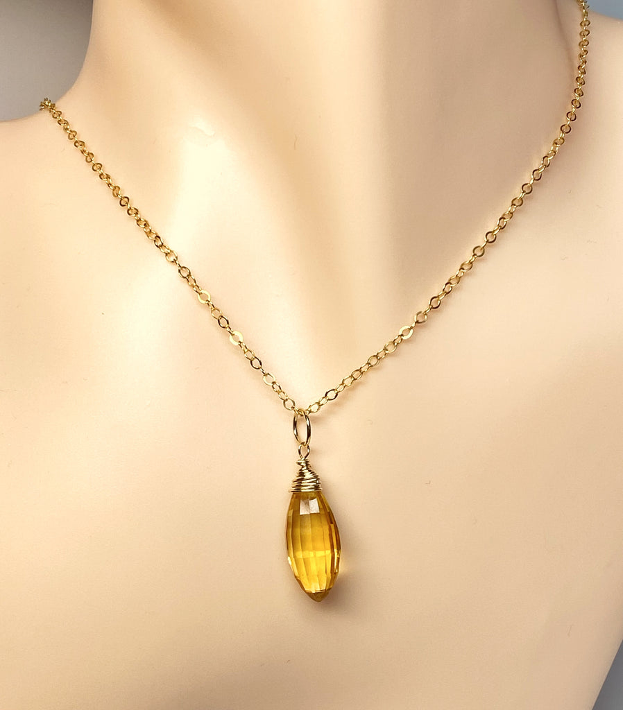 A beautiful, natural citrine, faceted marquis cut briolette, 20 mm x 8 mm x 6 mm, is wire wrapped in 14 kt gold filled wire to dangle on a gold filled ring on 14 kt gold filled chain to create this November birthstone pendant necklace.