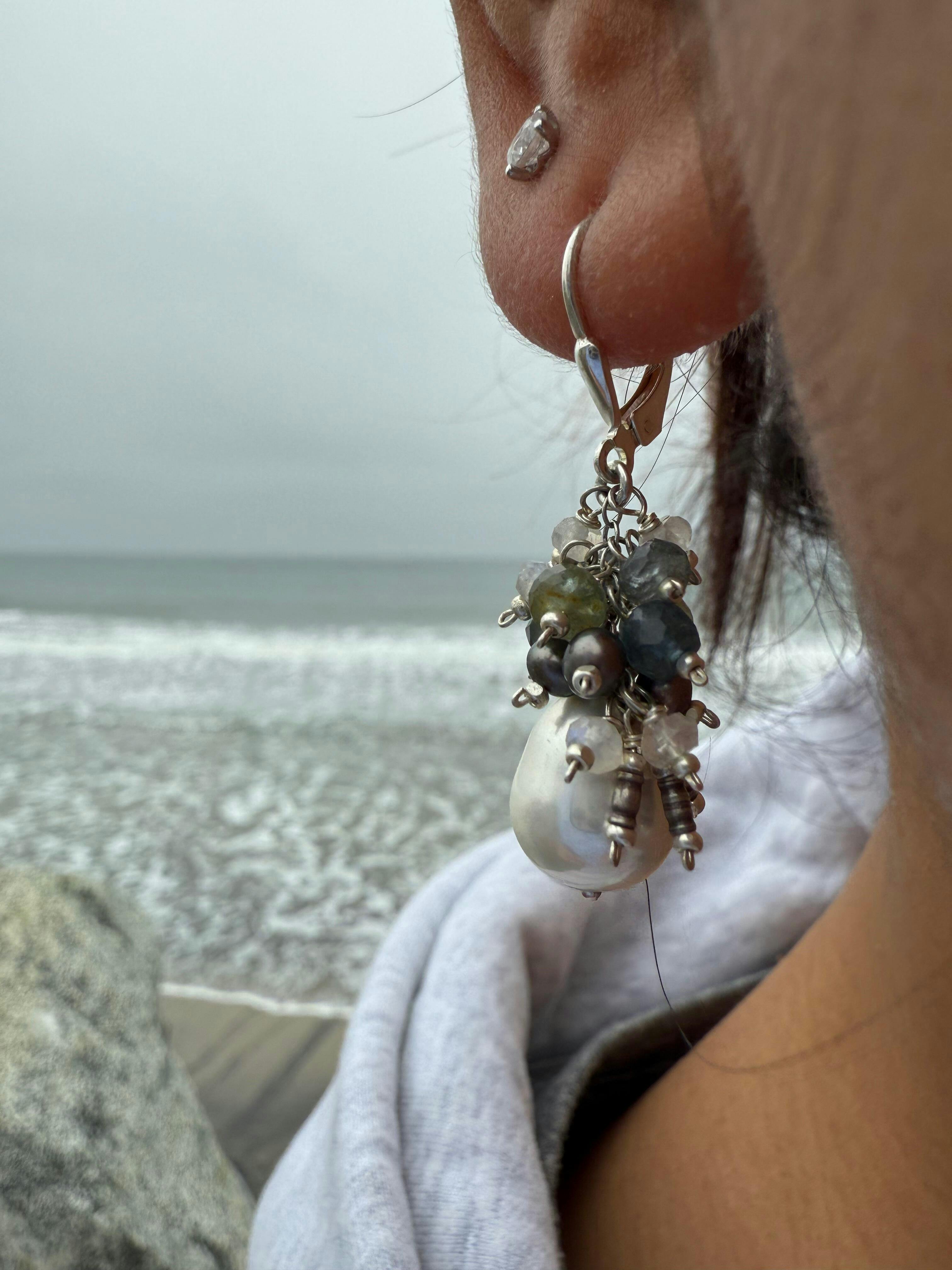 Lustrous, ivory, freshwater baroque pearls 13mm, wire wrapped on sterling silver ball headpins, dangle on sterling silver chains beneath clusters of multi-color gemstones and grey peacock pearls to create these colorful cluster earrings.