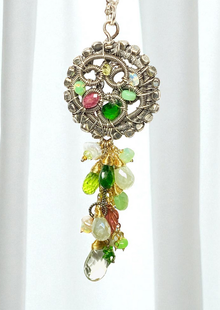 Below the circle, mixed metal chains dangle wire wrapped gemstone briolettes of chrome diopside, mystic prehnite, chrysoberyl, peridot and green amethyst with 14 kt gold filled wires.