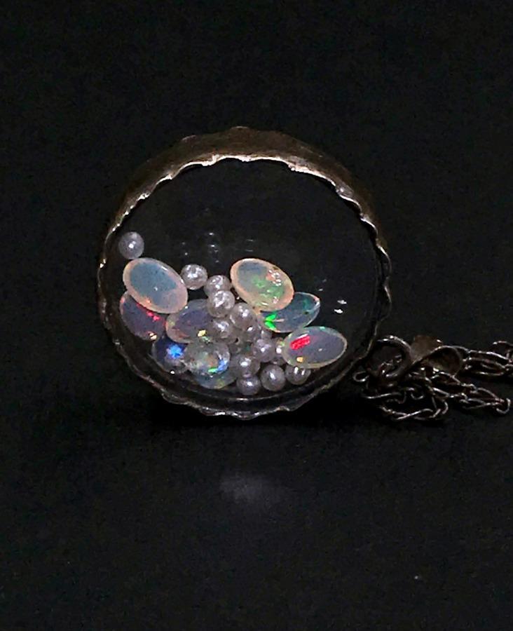 I made the sterling silver bezel for the watch glasses all by hand - a very detailed, time consuming process! There are 7 very fiery Ethiopian opal gemstones in the locket along with three beautiful moonstones and numerous pearls that make for a very eye catching conversation piece locket. It does not open; it is permanently sealed, so you won't lose any of the gorgeous gemstones.