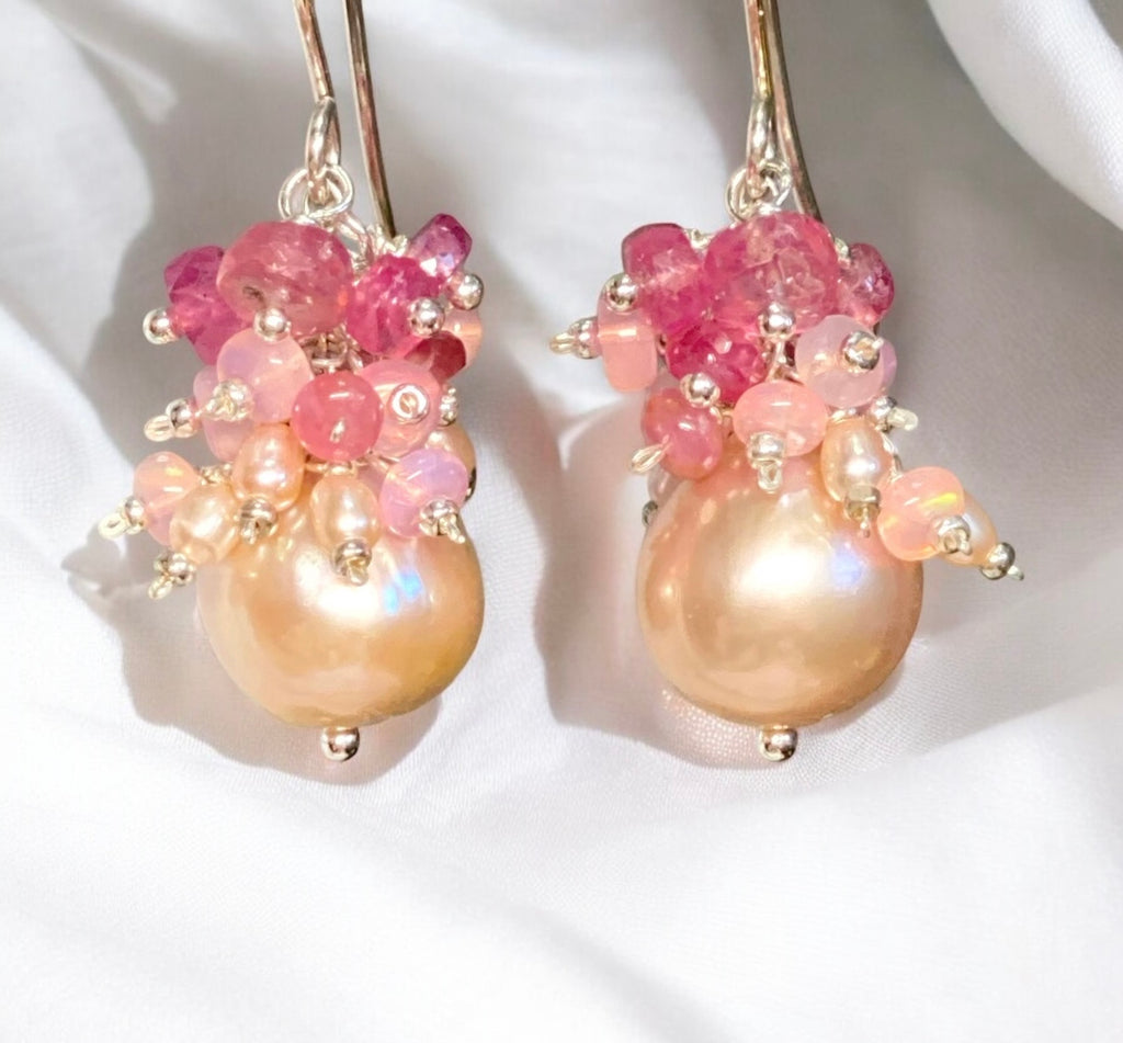 Pink Pearl Earrings with Pink Sapphire and Opal Clusters