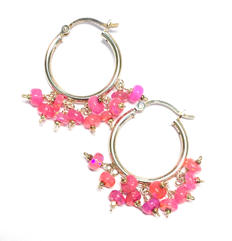 Sterling silver hoop earrings, 3/4 inches in diameter dangle stunning, fiery Ethiopian opals that are very fiery that appear hot pink, coral and soft pink all at once as the light hits them!