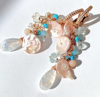Smooth teardrops of super blue flash rainbow moonstones, 14mm x 8mm, dangle below cascading clusters of pastel mixed color - turquoise, white, blue and pink - aquamarine, turquoise, blue chalcedony, pink Peruvian opal and rainbow moonstone rondelles mounted on rose gold fill headpins with blush freshwater keishi pearls for a feminine, dreamy, ethereal elegant look for Spring.
