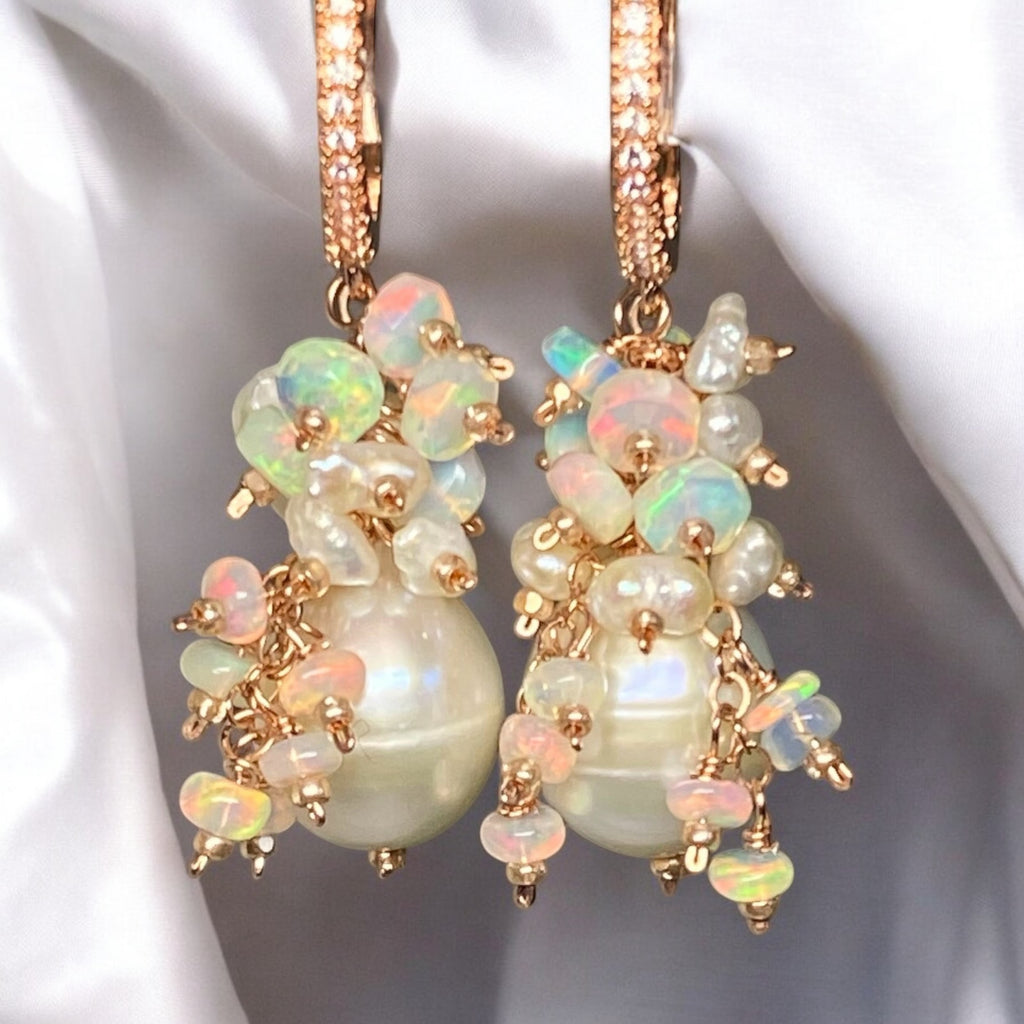 Creamy white freshwater pearls dangle beneath clusters of very fiery, AAA white Ethiopian opals mixed with lustrous, small keishi pearls to create these glamorous pearl earrings.