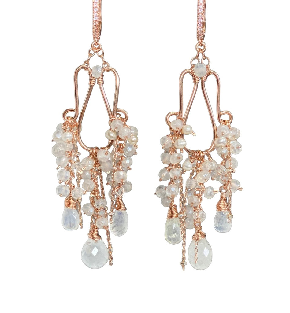 Rose gold filled hand forged chandelier forms dangle wire wrapped rainbow moonstone briolettes to create these romantic boho earrings.