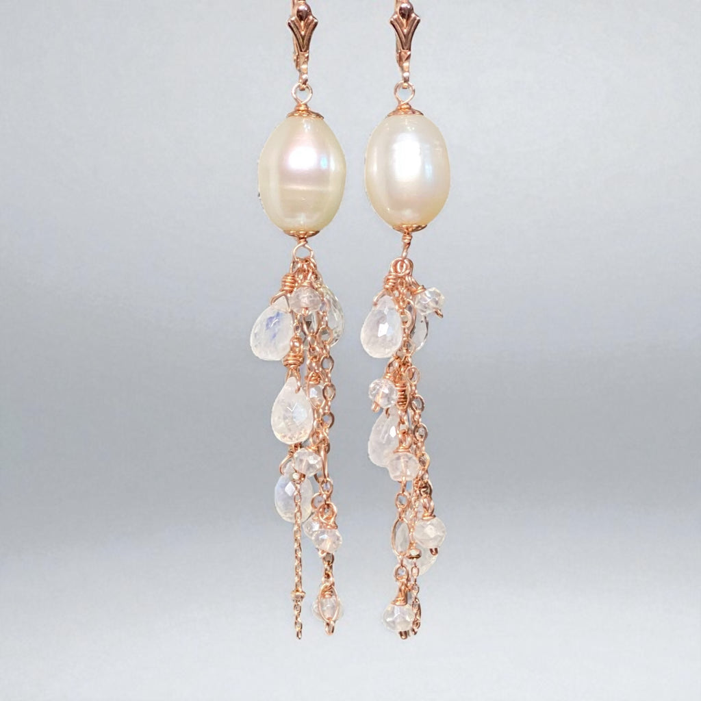Ivory baroque freshwater pearls, 13 mm, capped in rose gold fill bead caps, dangle rose gold filled chains that dangle rainbow moonstone teardrops, clear zircon natural gemstone pear briolettes, rainbow moonstone rondelles and mystic crystal quartz rondelles to create these long boho dangle earrings.