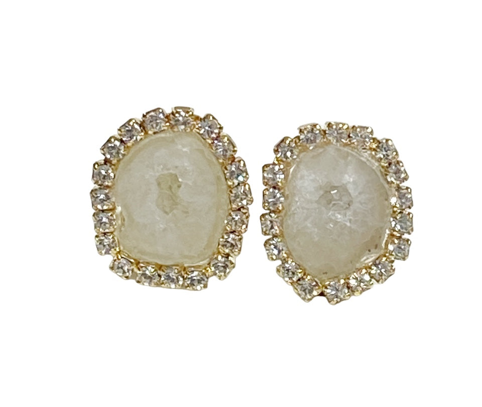 Baby tabasco geode slices in an ivory white color, rimmed in tiny, authentic, Austrian crystals, (by the famous name we all know but can't say anymore), are mounted as stud post earrings on sterling silver posts to create these petite dazzling earrings.