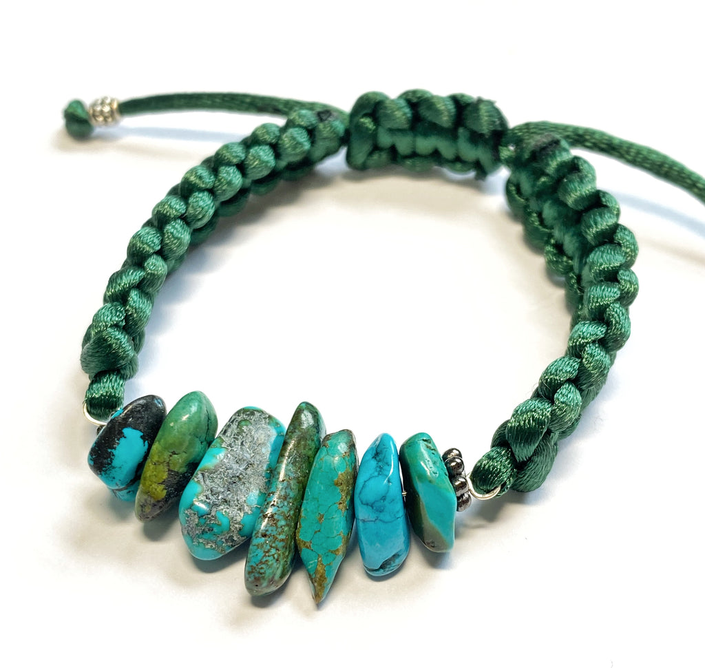 Beautiful, natural, Arizona turquoise nuggets center a macramé boho bracelet to create this stunning, adjustable stacking bracelet.