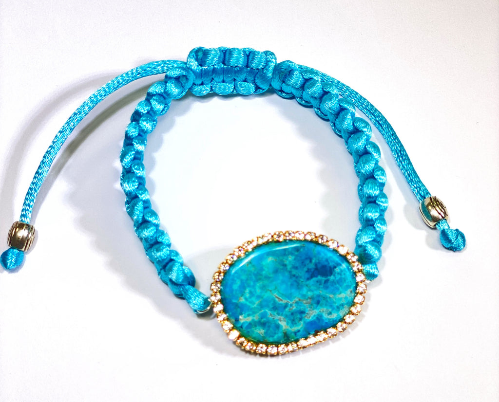 A beautiful turquoise gemstone slice, rimmed in Swarovski Elements to rival the look of diamonds, centers a hand knotted bracelet of turquoise silky cord to create this adjustable boho bracelet.