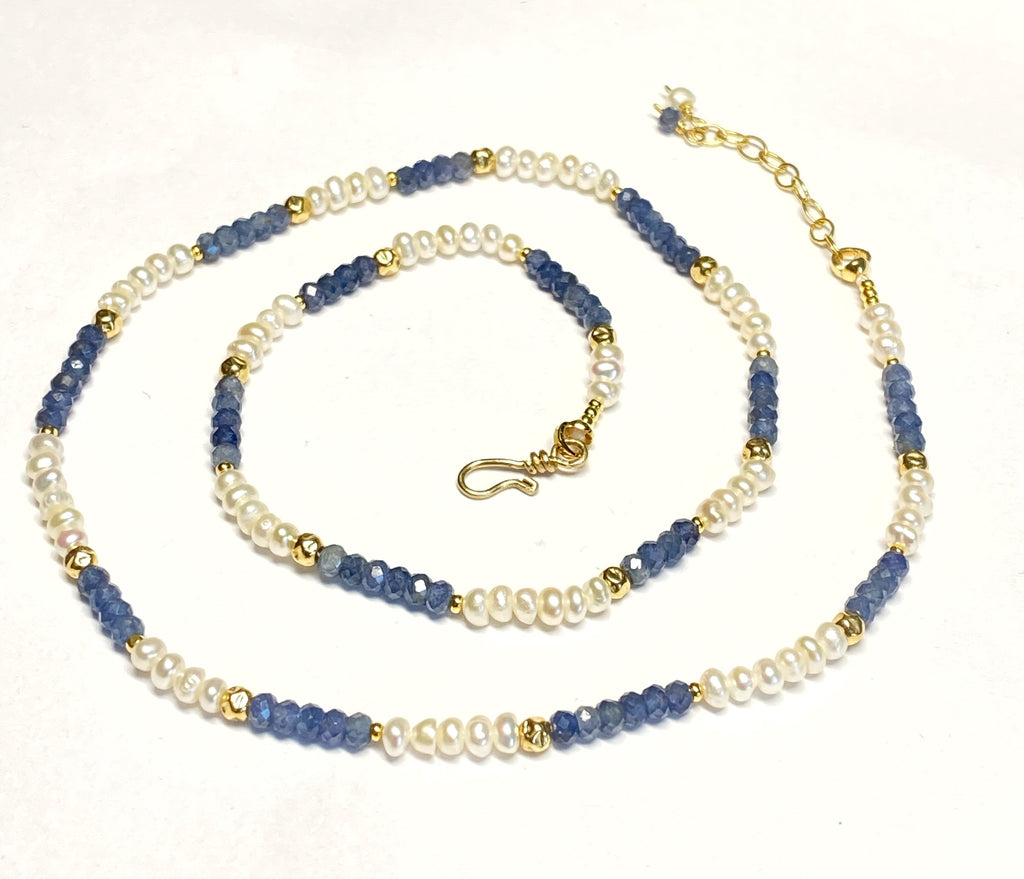 This dainty, blue sapphire and pearl necklace features faceted denim blue sapphires, 3 mm, with lustrous 3 mm small, freshwater pearls to create this great choker.