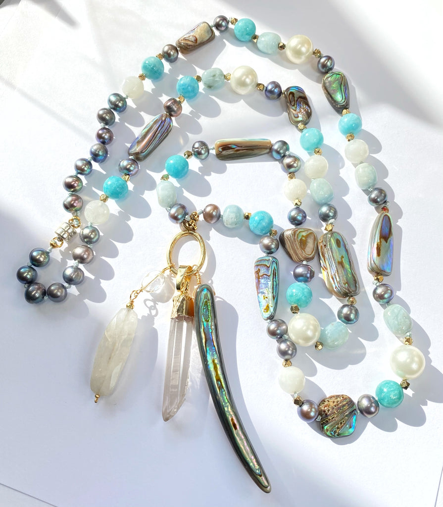 Abalone Long Necklace with Aquamarine, Moonstone, Pearl