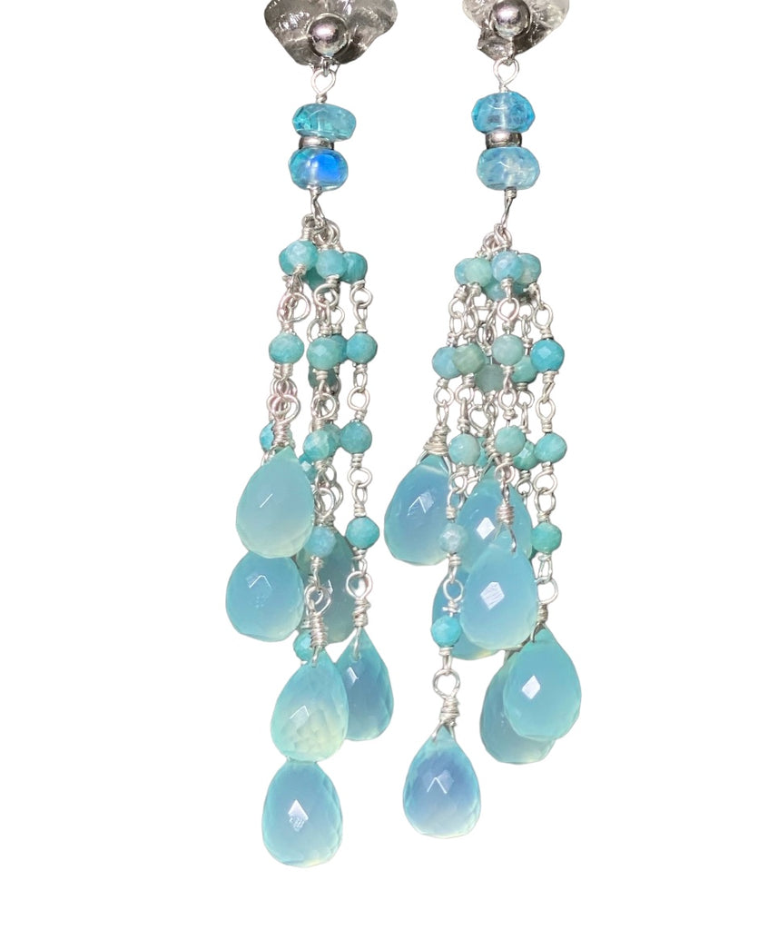 Faceted aqua chalcedony briolettes dangle from wire wrapped chains of amazonite, all on sterling silver to create these boho tassel earrings.