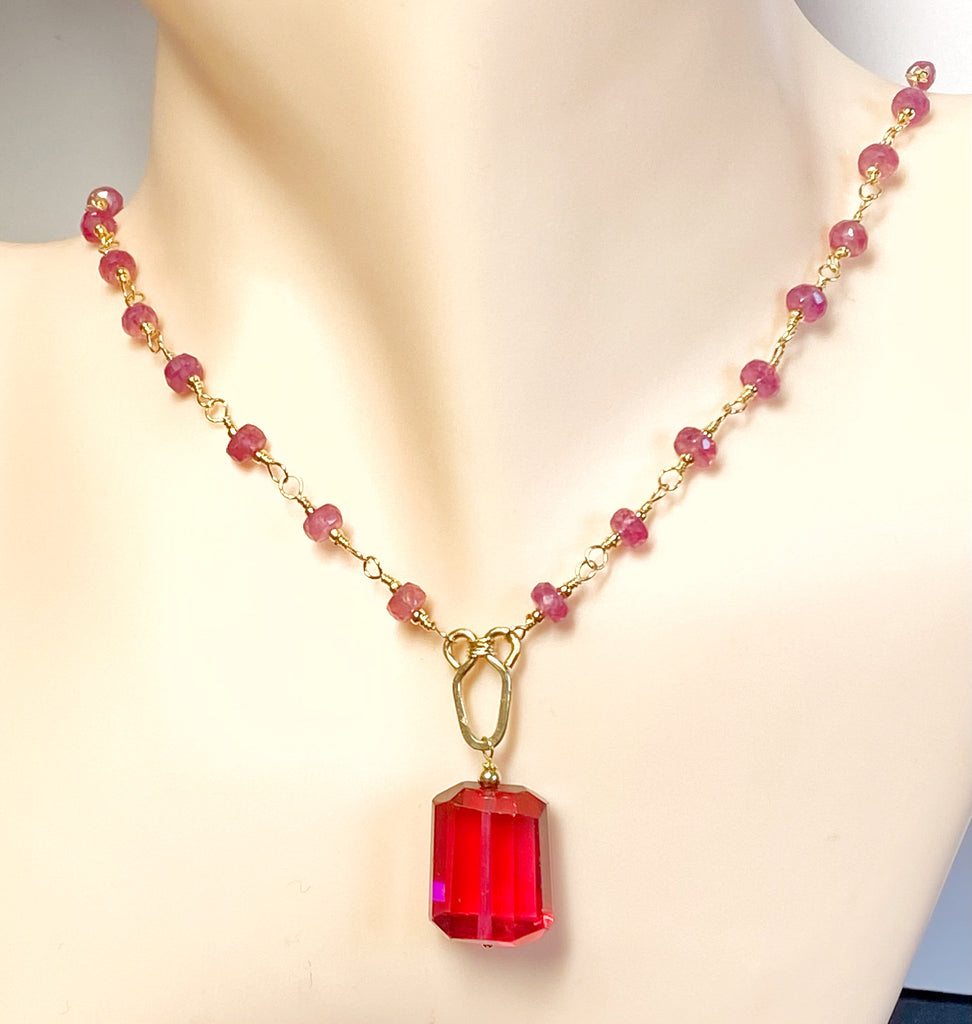 The prettiest pink spphire rondelles, 4 mm, are wire wrapped in 14 kt gold filled wires, dangling a faceted rubellite quartz pendant, to create this handmade pink gemstone pendant necklace.