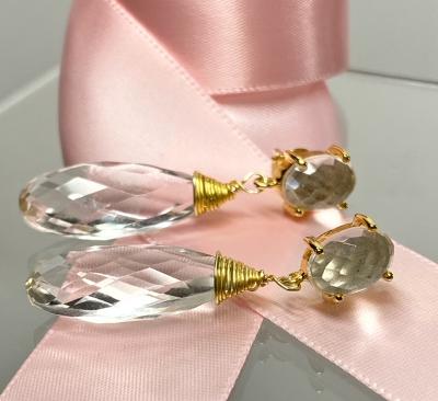 Faceted clear quartz long teardrop briolettes dangle beneath sparkling, faceted clear quartz cabochon post earrings in gold vermeil to create these brilliantly sparkling, handmade earrings. The briolettes are wire wrapped in gold vermeil wire to match the gold on the post earrings.