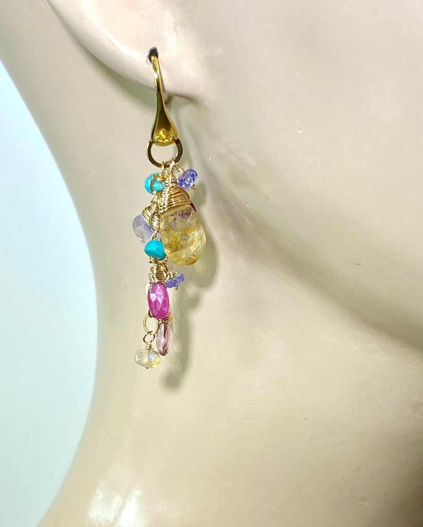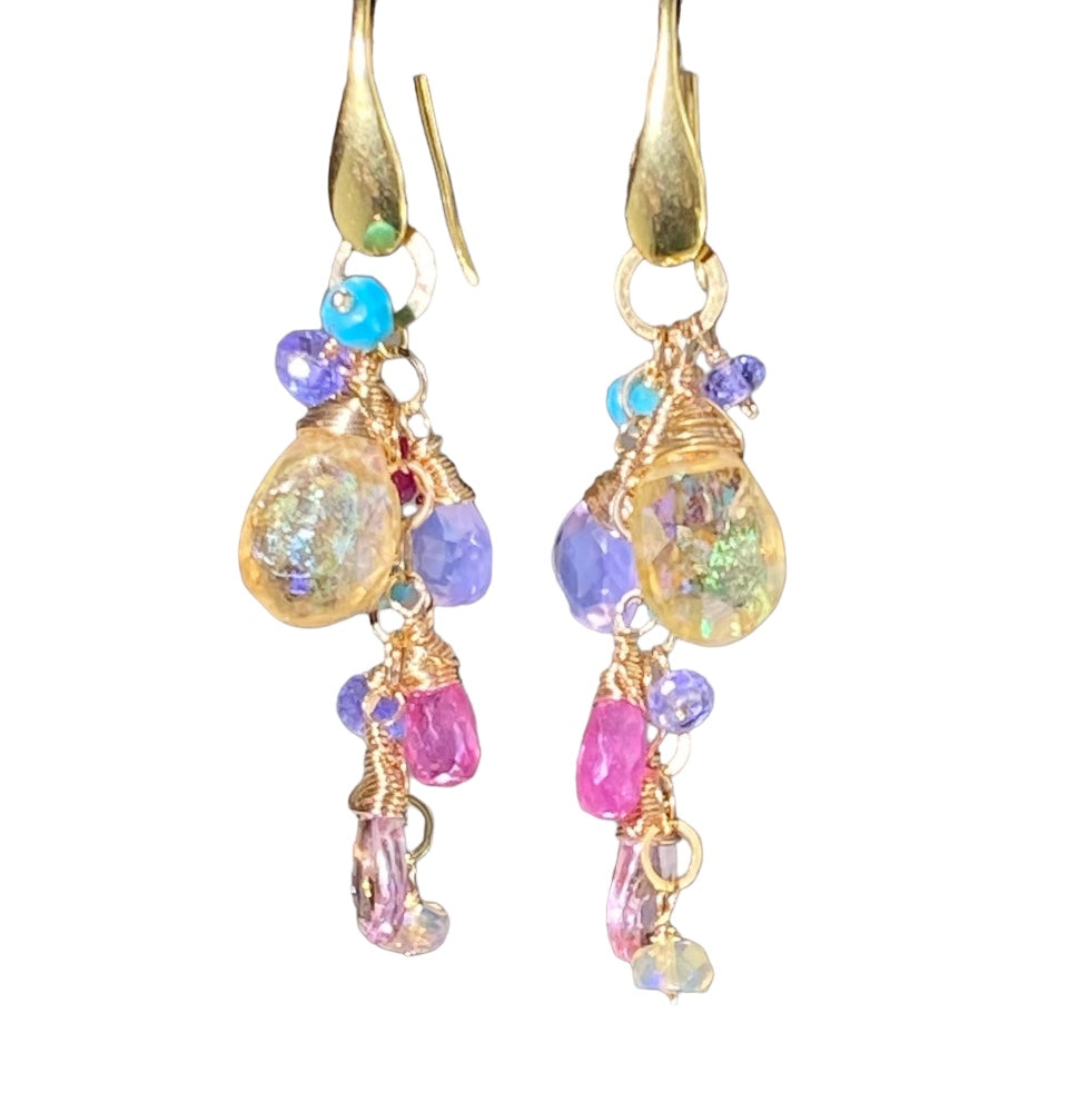 Colorful gemstones of mystic citrine, lavender opal scorolite, hot pink corundum quartz, tanzanite, pink sapphire, pink topaz, Sleeping Beauty turquoise and Ethiopian opals are wire wrapped in yards of 14kt gold filled wire to dangle from 14kt gold filled chains to create these cheerful boho earrings.
