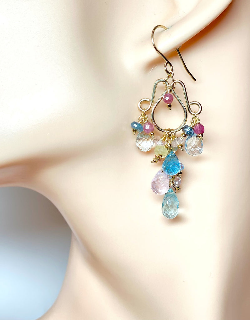Top quality, aqua, blue and pink morganite aquamarine gemstone teardrops, wire wrapped on yellow 14 kt gold filled wires, dangle on 14 kt gold filled hand forged chandelier forms to create these glamorous chandelier earrings.