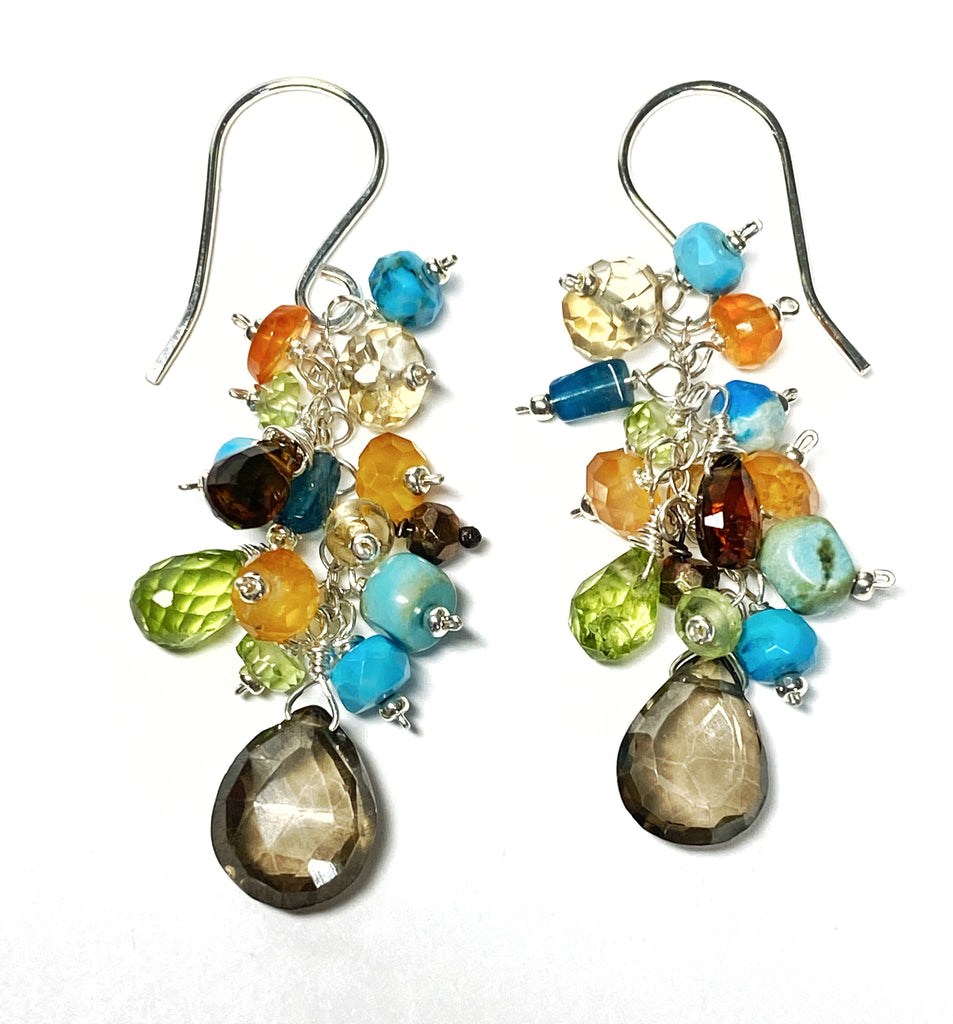 Colorful gemstones dangle over mystic smokey brown quartz drops to create these very stylish, boho earrings that will coordinate with many of your casual looks.