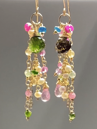 Large and plump, 9 mm x 11 mm x 6 mm, high quality, faceted, green tourmaline briolettes are wire wrapped to dangle on 14 kt gold filled rings with wire wrapped chains of gems I created with faceted tourmaline round gems, and one chain I wire wrapped with sparkly pink quartz and a dangling pink topaz teardrop gem at the bottoms, to create these dainty boho dangle earrings.