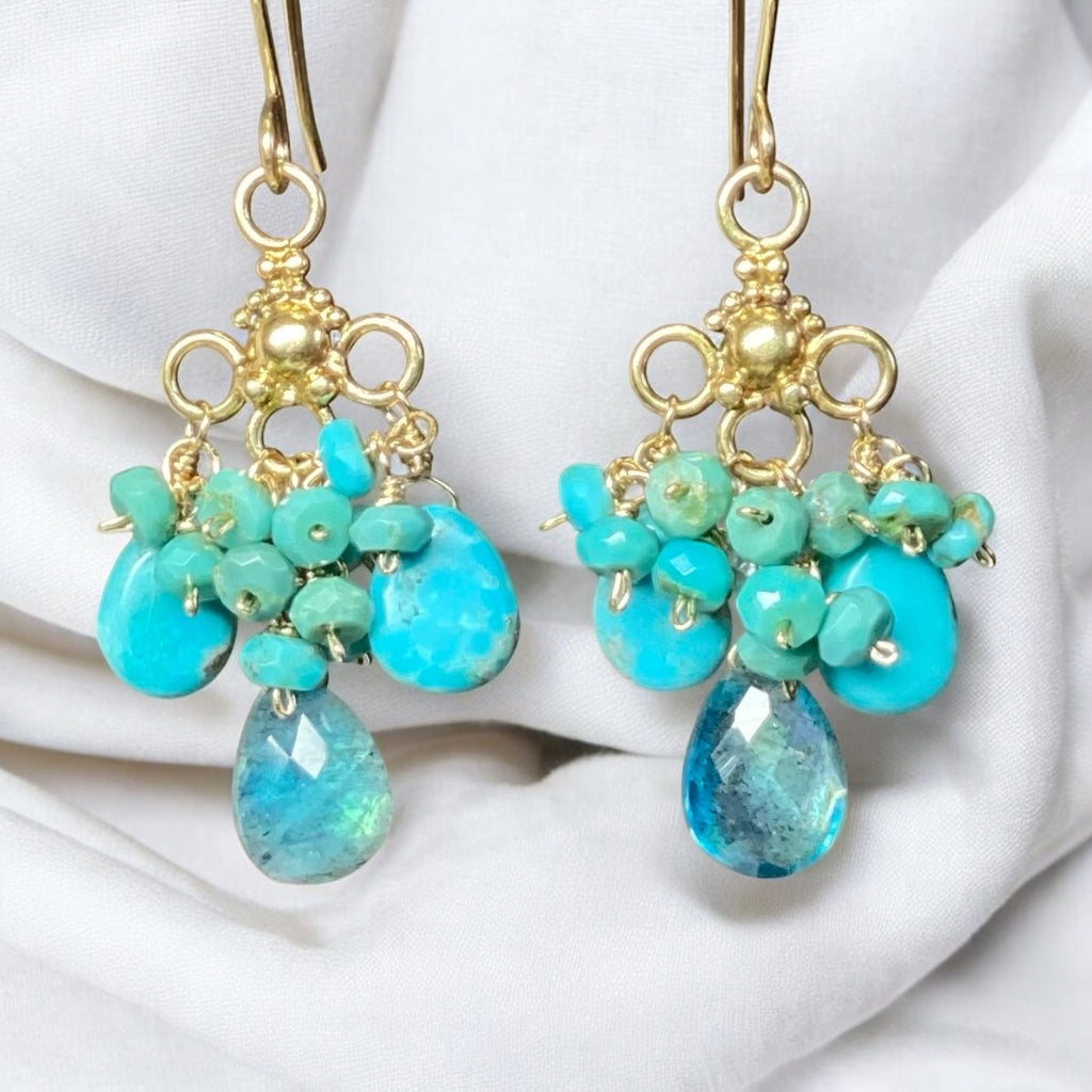 Clusters of genuine turquoise rondelles dangle over Kingman mine turquoise briolettes that center beautiful, shimmering doublet briolettes of flashy labradorite and blue topaz to create these mesmerizing earrings.