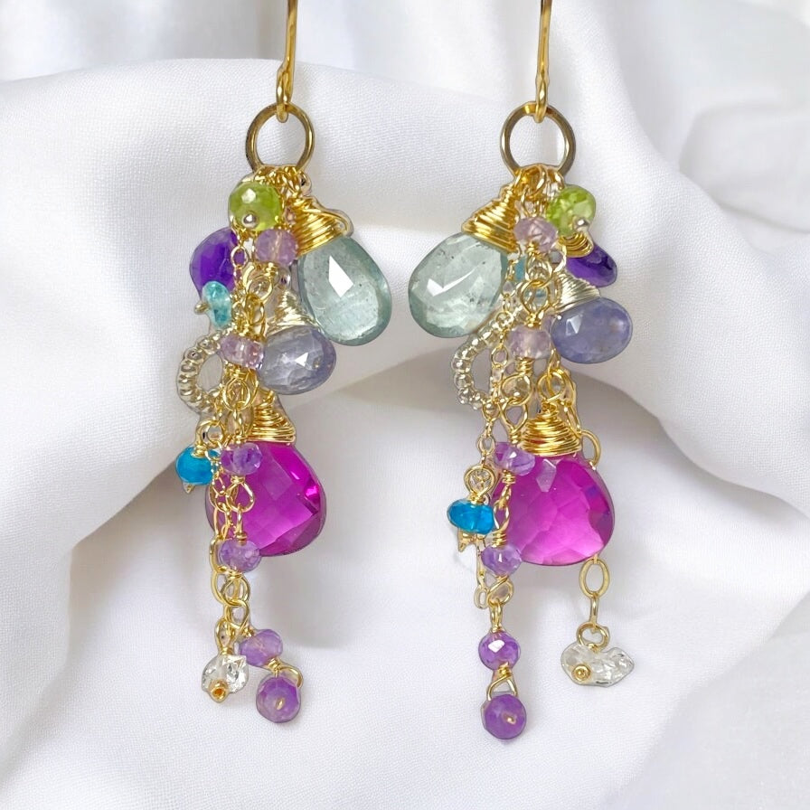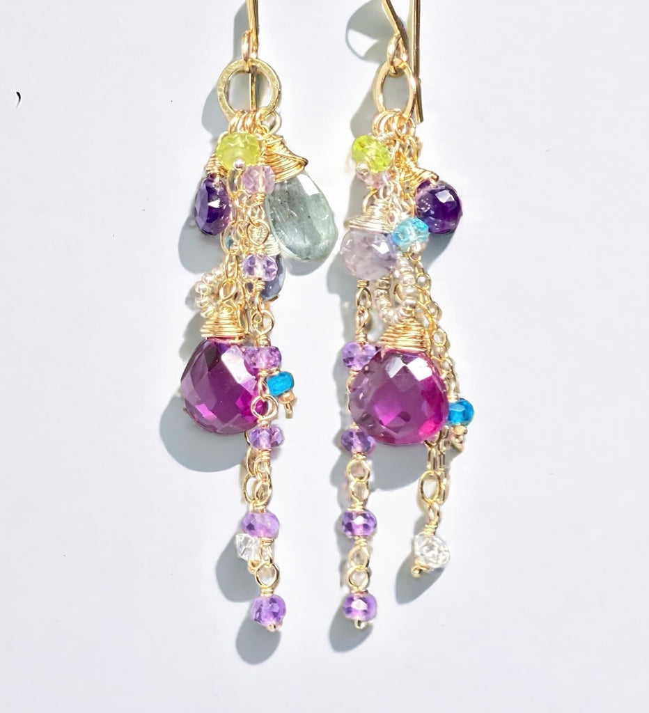 14 kt gold filled chains dangle dreamy gemstone briolettes of moss aquamarine, purple amethyst, blue iolite and violet quartz while gemstone rondelles of peridot, neon and aqua apatite dangle alongside them