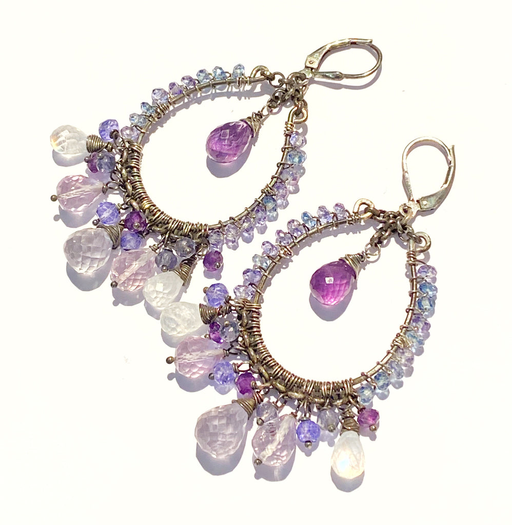 Centering the hoops are faceted amethyst teardrops; centering the bottom chains are mystic blue denim quartz teardrops, pink amethyst teardrops and rainbow moonstone teardrops with lots of blue flash!