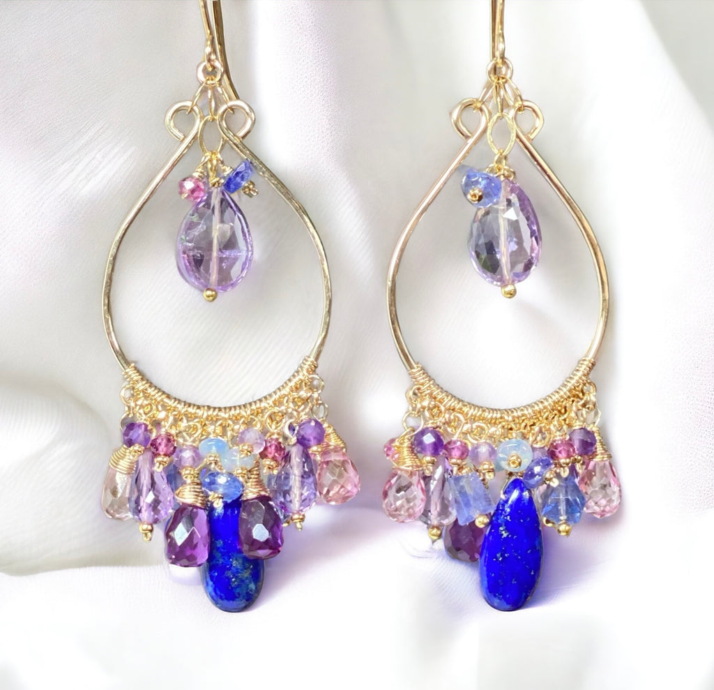 The dreamiest pink, blue, purple and lavender gemstones dangle on gold filled chains on gold filled hoop chandeliers to create these romantic, flirty earrings.
