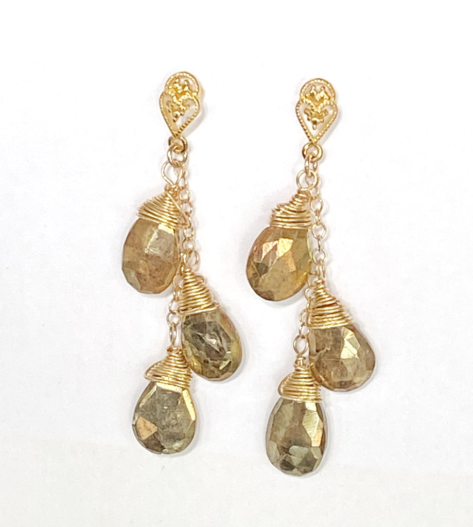Mystic gold labradorite faceted briolettes with a brilliant gold flash are wire wrapped in gold filled wires to dangle on 14kt gold filled chains from gold vermeil post earrings