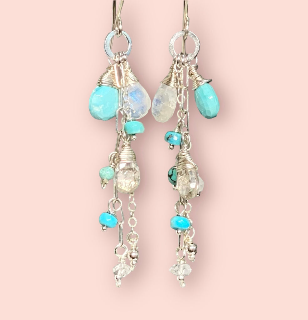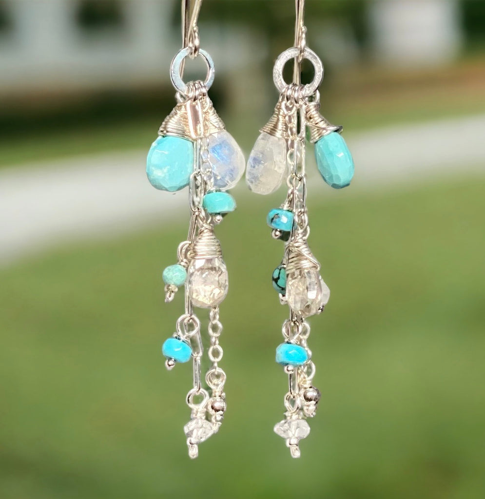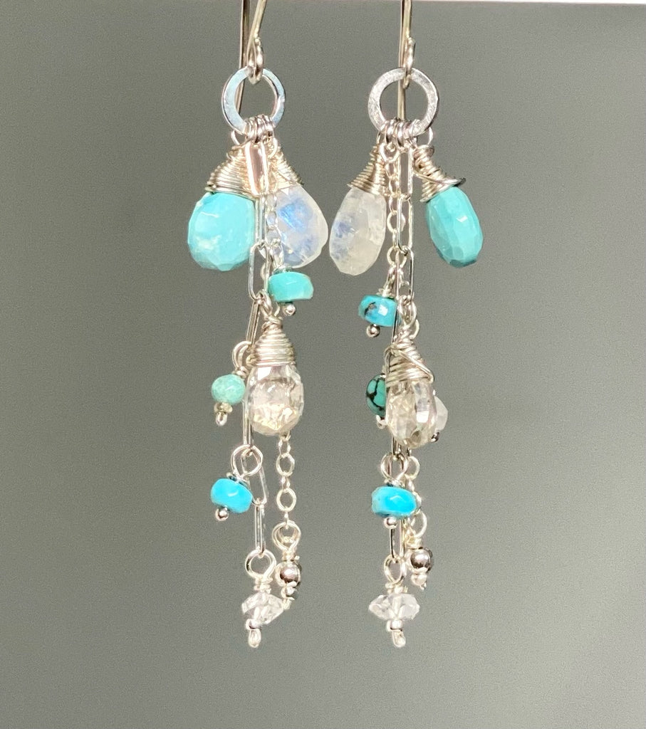 * Sleeping Beauty turquoise, rainbow moonstone, white natural zircon gemstone, turquoise, mystic chalcedony rondelles, Herkimer diamond quartz crystals, Larimar rondelles