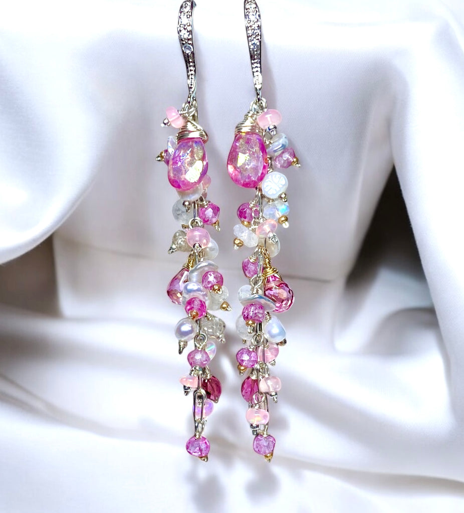Sterling silver paperclip chains dangle beautiful pink gemstones, pink opals, moonstones, pearls, keishi pearls and more to create these long duster earrings.