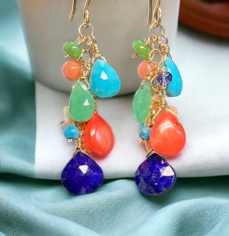 Colorful gemstone briolettes of blue lapis, coral, chrysoprase and Kingman turquoise are wire wrapped in 14 kt gold filled wire to dangle with branch coral and coral nuggets and rondelles of turquoise green Ethiopian opal and blue quartz to create these boho dangle earrings.