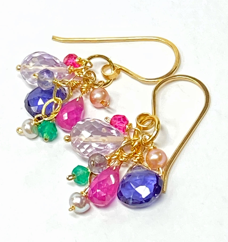 These are dainty multi-color gemstone dangle earrings wire wrapped on 14 kt gold filled wires, chains and- earrings.