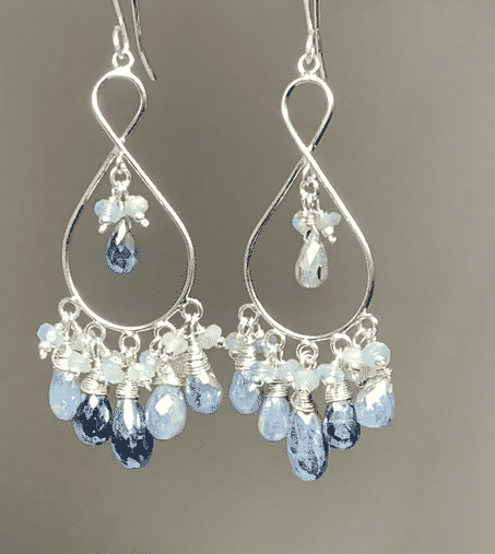 Silver mystic kyanite briolette teardrops dangle from infinity shaped sterling silver chandelier earrings to create these shimmering boho earrings.