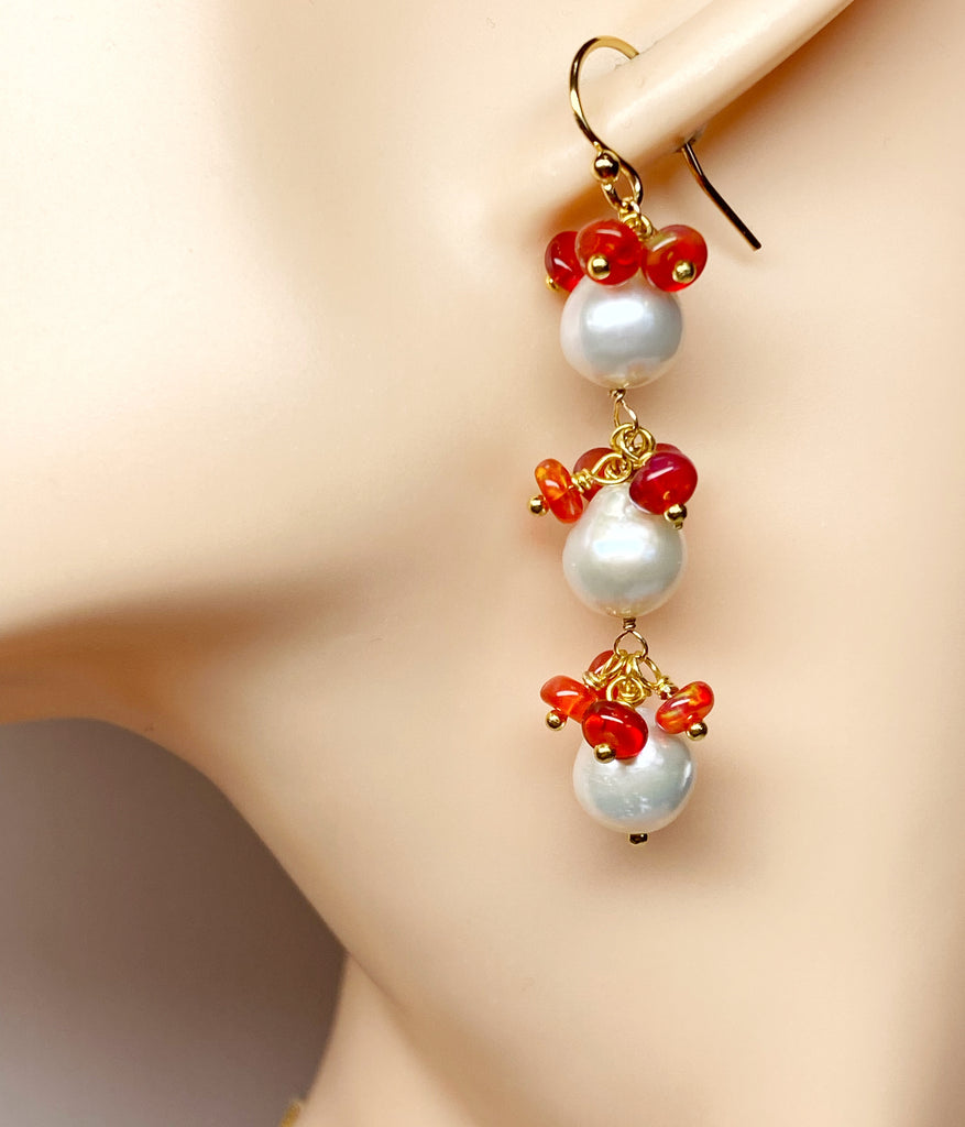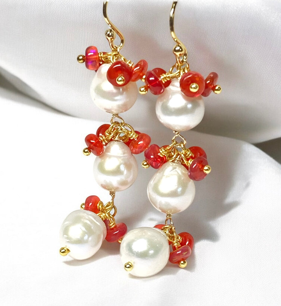 Creamy white baroque pearls, 9 mm, dangle with clusters of very fiery, smooth, red Ethiopian opal rondelles to create these dreamy dangle earrings in 14 kt gold fill and gold vermeil.