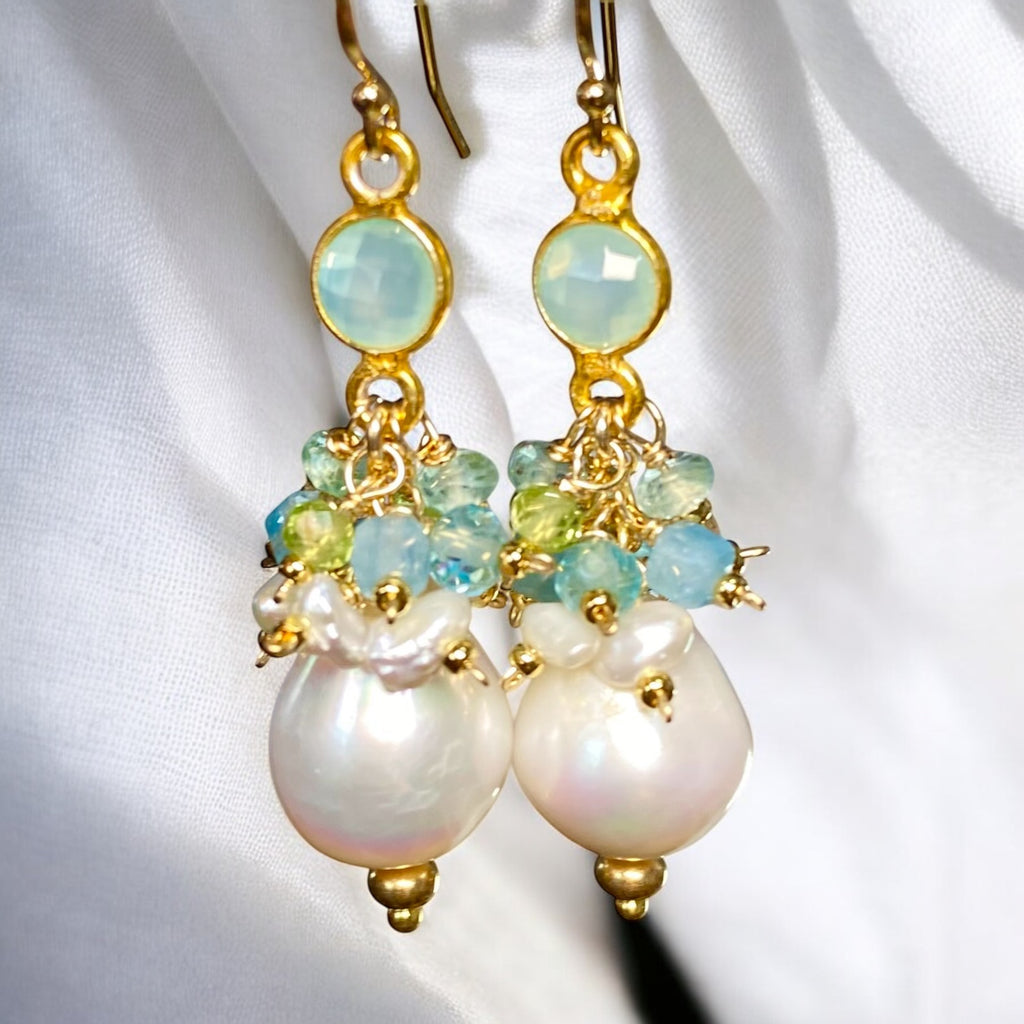 Gemstones of peridot, apatite and blue aquamarine mix together in clusters with fancy gleaming small keishi pearls over freshwater pearls to create these elegant pearl earrings that dangle from aqua chalcedony connectors.