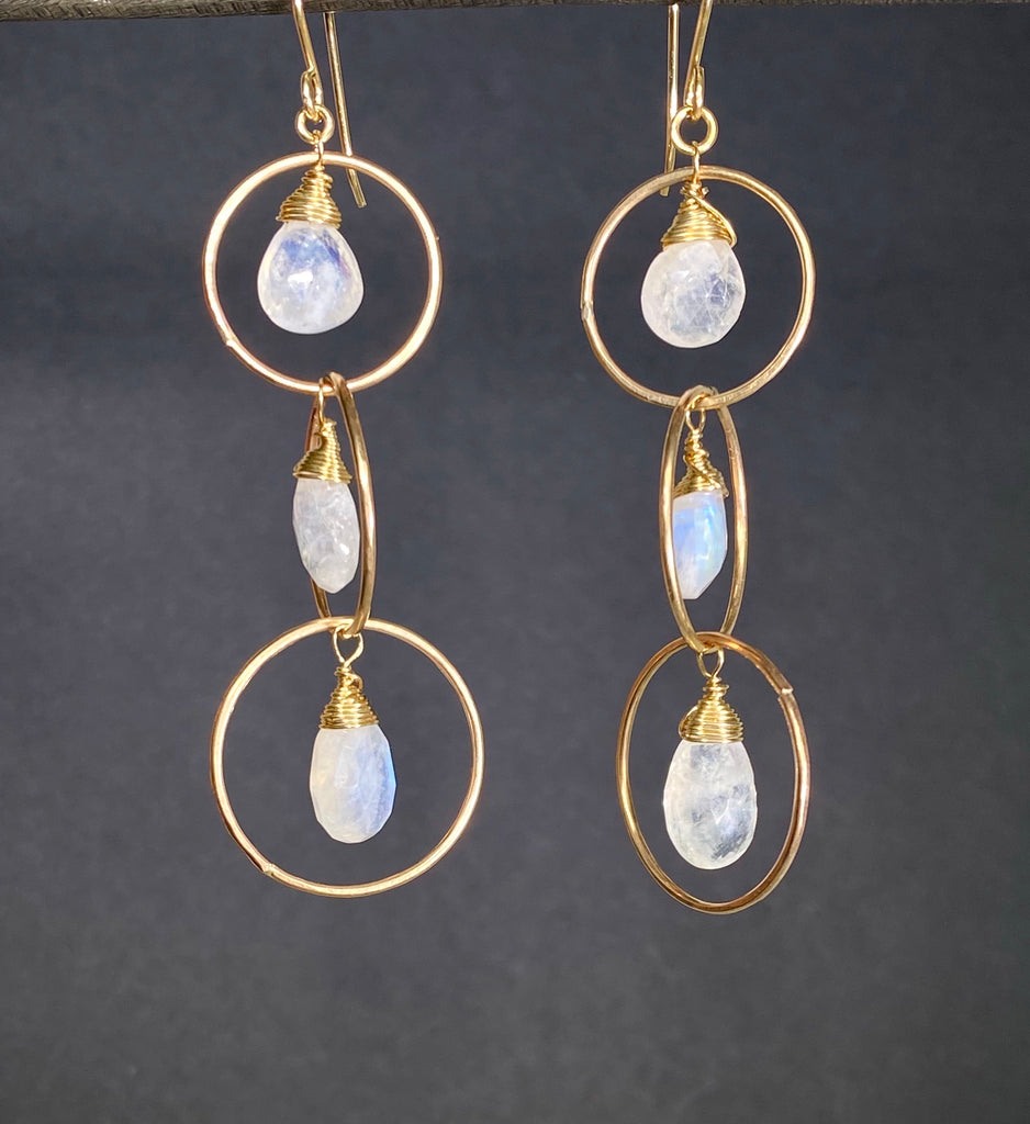 leaming 14 kt gold filled interlocking hoops dangle in graduated sizes to catch the light as they move on the ears while dangling blue flash rainbow moonstone teardrops.