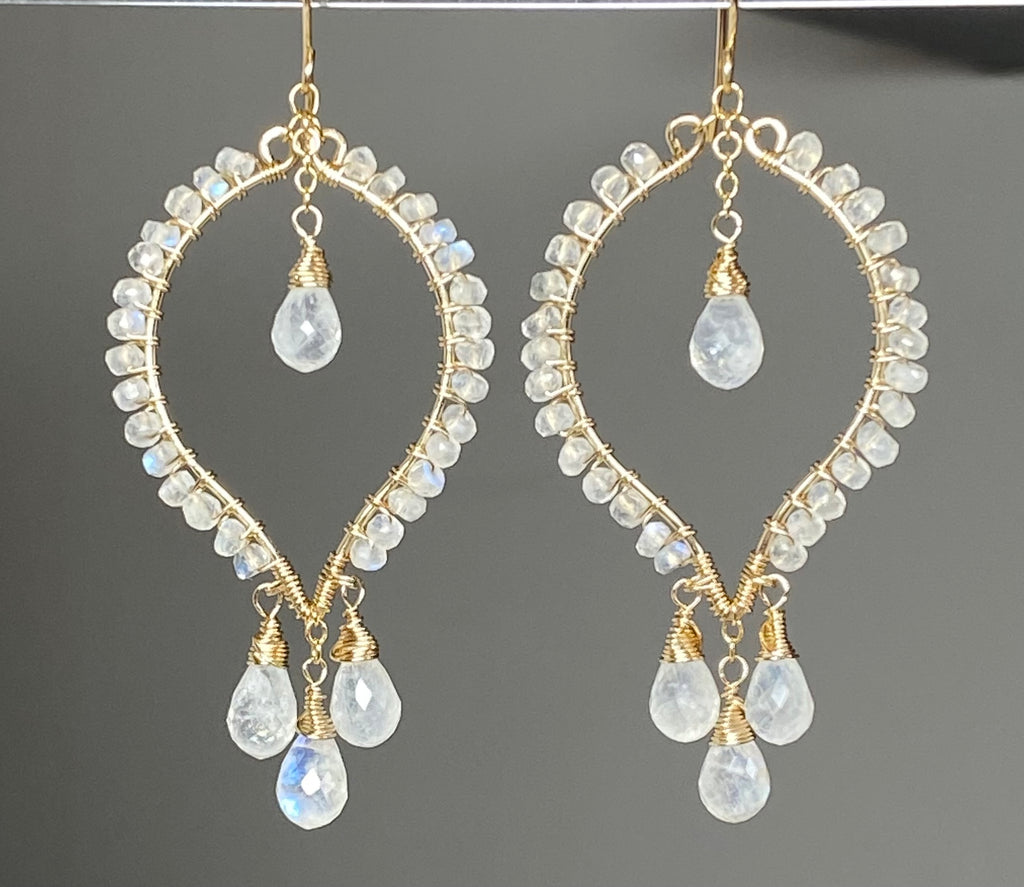 Rainbow moonstone rondelles, wire wrapped to the sides of the hoops, also have the blue inner shimmer, complementing the teardrops.