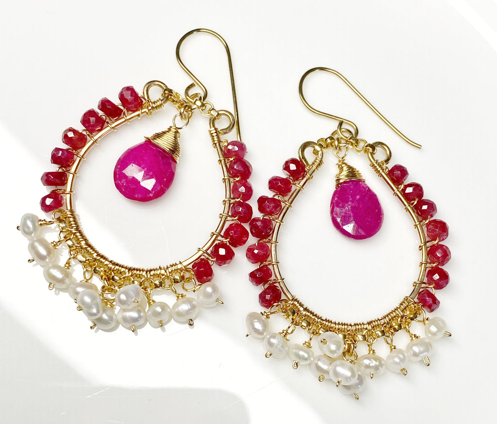 Hand forged 14 kt gold filled hoop earrings are wire wrapped with beautiful, sparkling, faceted ruby rondelles up the sides of the hoops while gold filled wired chains along the bottom of the hoops dangle lavish clusters of pearls.