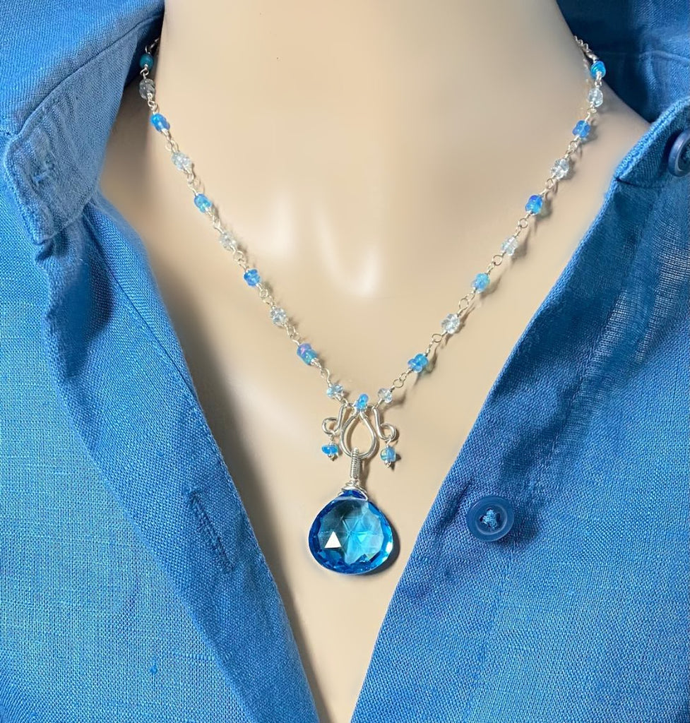 Sterling silver, wire wrapped chains of alternating stations of blue topaz and fiery blue Ethiopian opals dangle a hand forged sterling silver bail that dangle an incredibly sparkly, faceted, Swiss blue hydroquartz large pendant stone to create this elegant pendant necklace.