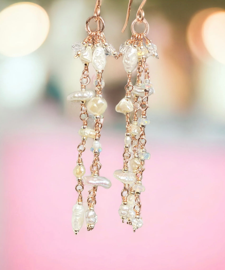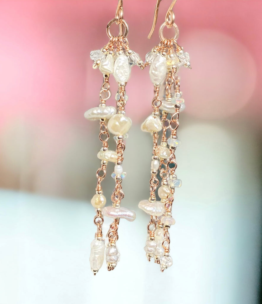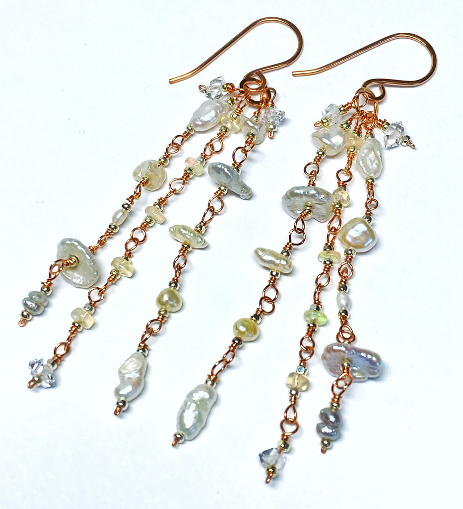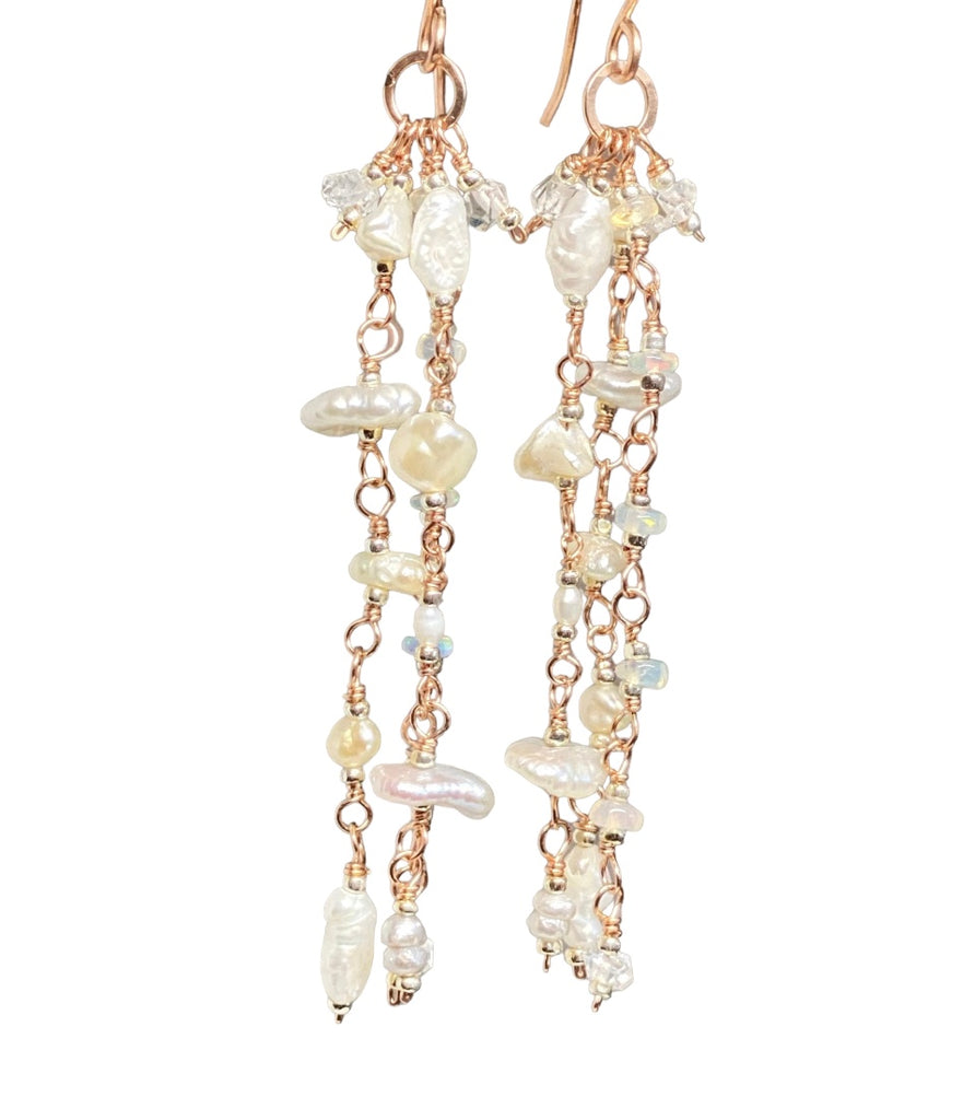 Rose Gold Dainty Pearl Boho Dangle Earrings with Opals, Herkimer Diamonds and Keishi Pearls